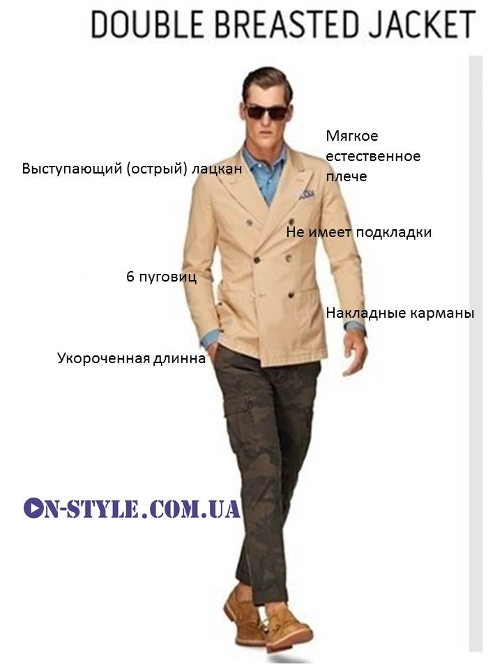 Double breasted jacket летний вариант пиджака, хорошо будет смотреться на высоких мужчина с тучной комплекцией, но с жесткой линей плеча. А вот если рост не высокий или хочется добрать вес, то такая модель будет смотреться слишком бесформенно.