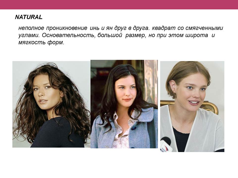 Самые крупные из всех типажей. Но это не мягкая полнота, а упругое тело на котором много «мяса». Могут быть немного приземистыми (коренастыми) или высокими, но не худощавыми, как драматики, а иметь плотные мышцы и кости. Можно сказать, что мода Голливуда в 90х высокие, крепкие, спортивные это как раз о натуральном типаже. Грудь может быть выражена или нет, но часто широкая грудная клетка, не четкая линия талии и достаточно прямые бедра. В отличии от романтического типажа размер ноги и ладони стремятся к крупному, как бы создавая большую устойчивость. Черты лица крупные, но более округлые. Губы и глаза могут быть, как прямыми так и округлыми, но тяготеют к широким. Часто широко посажены глаза. Внешность бывает разной, но чего не будет так это соразмерности. Цвета во внешности чаще глубокие, спокойные.По характеру создают впечатление: свободных , но надежных, напористых, ответственных.