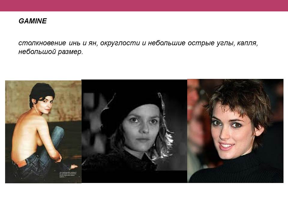 Самый миниатюрный из типажей по Девиду Кибби. Это Инь в лице, но Ян в теле. Женщина-ребенок. Вы можете себя смело отнести к этому типажу, если вам  за 25 а у вас до сих пор спрашивают «-девочка, а тебе 18 уже есть?».  Черты лица до очень взрослого возраста остаются детскими. Большие глаза, аккуратный ротик, округлые щечки. Очень подвижная мимика. Часто особенностью бывают уши, или очень маленькие, или по-детски топорщащиеся. При этом тело достаточно сухонькое, и даже если набирает вес, то не появляются округлые заветные формы. Вряд ли будет четкая талия. Рост не высокий. Большинство девушек типа Гамин смотрится хорошо с короткими стрижками или озорной челкой. Волосы часто тонкие и шелковистые. Цветотип яркий или средний контраст. Характер воспринимается как  любознательный, активный, игривый. Иногда кажутся нуждающимися в опеке.