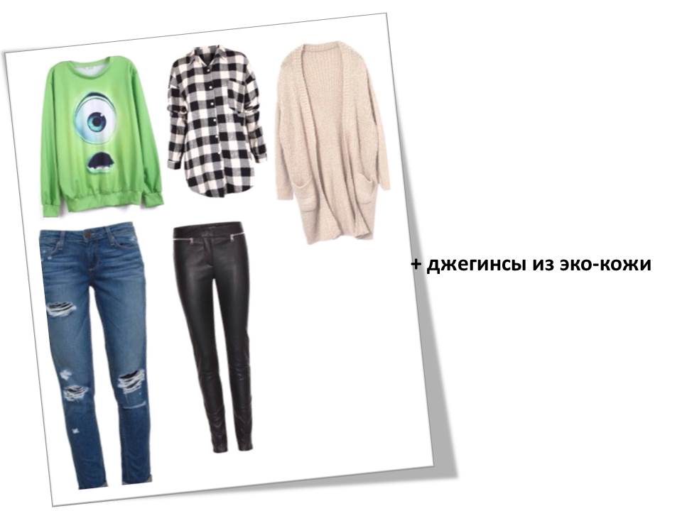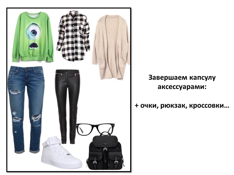 Берем джинсы из базового гардероба (напоминаю вещи базового гардероба должны подходить вам по цвету, фасону и стилю, а так же быть хорошего качества. Такая вещь служит 3-5 сезонов) добавляем в этом же стилевом направлении рубашку или футболку (они могут служит первым слоем одежды или надеваться самостоятельно), свитшот/джемпер/свитер (служит первым, вторым или самостоятельным слоем ) и распашной верх. Для того что бы разнообразить капсулу добавляем взаимозаменяемую джинсам вещь. Я выбрала более модные сейчас джегинсы из эко-кожи. И последним этапом является подбор аксессуаров. Здесь я остановилась на минимуме. Очки, рюкзак, кроссовки. Отвечают потребностям капсулы (мобильность и движение) и являются завершающим акцентом.