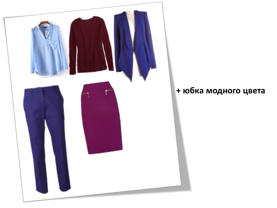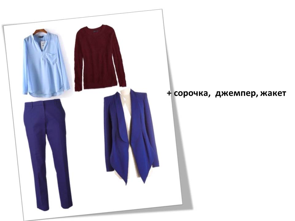 Для рабочей капсулы, как основу я взяла синие брюки. Кстати для деловой одежды черный используются  крайне редко.  Черный костюм — для особых случаев типа траур или свадьба … ;, если вы выбираете одежду на каждый день, то выбирайте синий, серый, коричневый. Добавляем сорочку или блузу, кашемировый джемпер и жакет. Жакет может быть как костюмным в паре к брюкам, так и отличающимся по ткани, но все равно, в деловом векторе.  Как альтернативу брюкам , добавляем юбку модного оттенка и завершим капсулу минимумом аксессуаров. Сумку и обувь для делового гардероба выбирайте нейтрального оттенка, без дополнительных деталей. Для того чтобы не выглядеть старомодно подбирайте эти аксессуары в разных цветах, но родственной цветовой гамме.