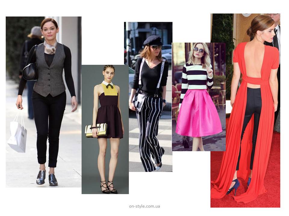 Поскольку во внешности сталкиваются инь и ян, подойдут контрастные верх и низ и разбитый силуэт. Крой должен быть по фигуре, без обьема или чрезмерного облегания. Линии вырезов, рукавов и подолов должны быть четкими, сидящие по фигуре с яркой отделкой и мелкими деталями. Не стоит стараться создать сплошную вертикаль это «убъет» всю динамику образа. Гаминам подходят классические костюмы, но если не разбавить их ярким цветами, то будут скучновато выглядеть. Наиболее губительно для чистого гамина это натуральские образы. Обьем в волосах и текучесь в тканях, недостаток макияжа – это все сделает внешность болезненной.