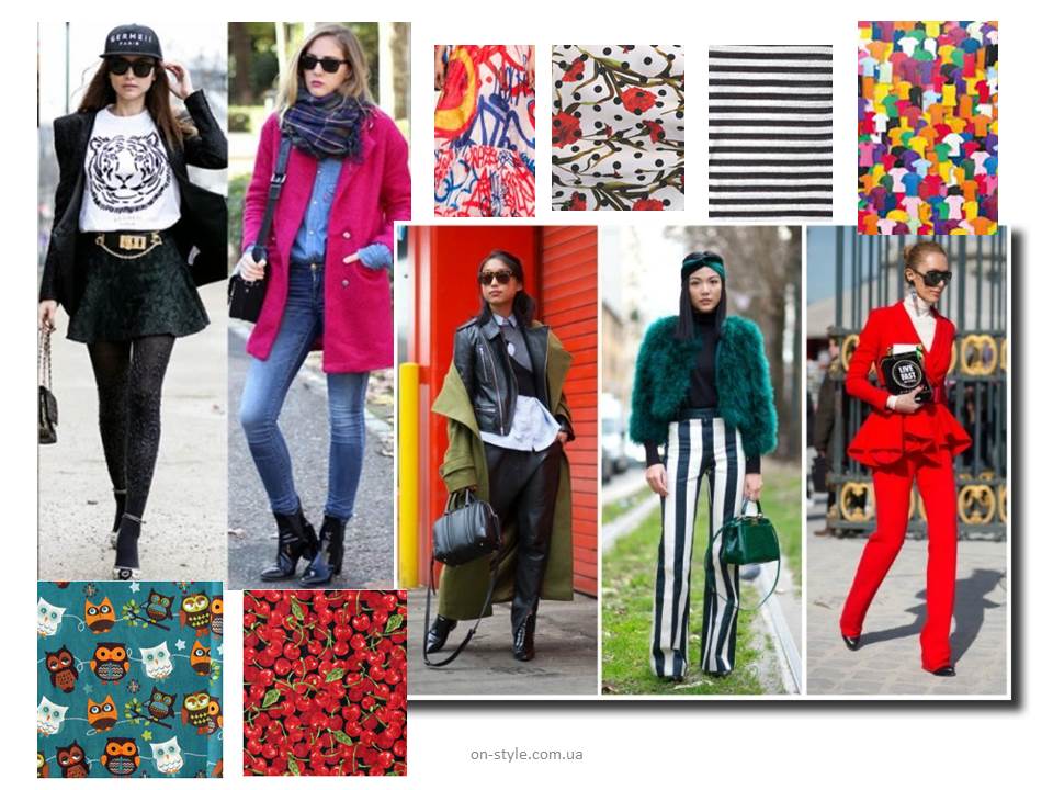 Принты яркие и веселые, повторяющиеся часто повторяющиеся или один яркий принт с сюжетом. Ткани должны держать форму иметь плотность от средней к более жесткой. Хорошо подходят сочетание различных фактур и размеров рисунка.